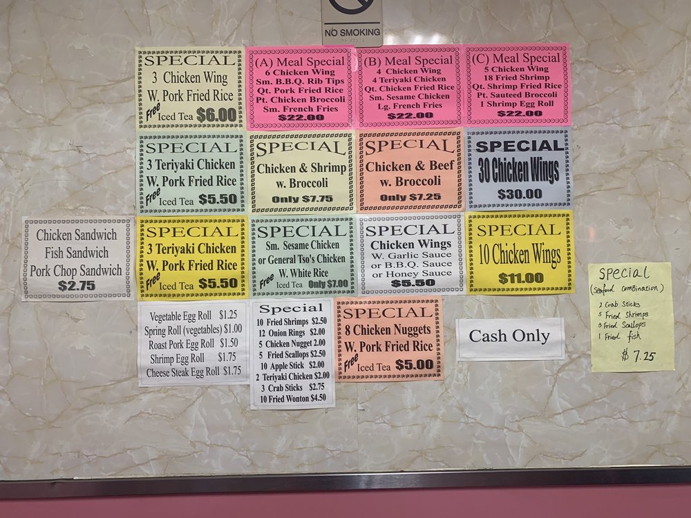 6 pieces small chicken wings, small french fries, quart of BBQ Rib tips, pint of pork fried rice and chicken with broccoli.