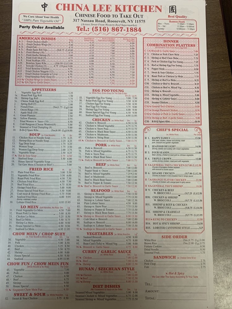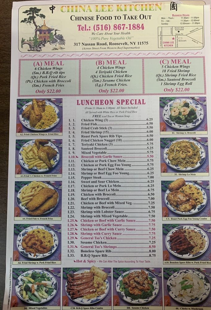 Welcome to China Lee Kitchen, a beloved gem located at 317 Nassau Rd, Roosevelt, NY. Specializing in traditional Chinese cuisine, this family-owned establishment has garnered praise for its exceptional service and delicious offerings. Whether you're in the mood for savory roast pork or comforting dumplings, the menu tantalizes your tastebuds with an array of appetizers and main dishes.